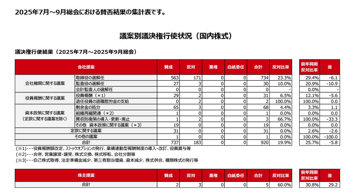 なお、議決権行使にあたっては、形式的に判断するのではなく、投資先企業との建設的な対話を踏まえ、企業価値向上の観点から判断を行います。