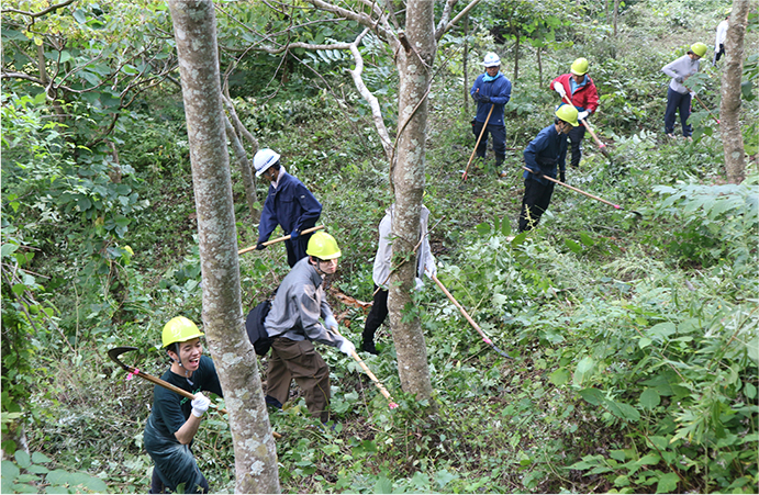 カマを使って、木に巻き付いたツルや根元に生えている下草などを丁寧に刈り取っていきます。こうした作業を通じて、木が健やかに成長できる環境を整えることができます。