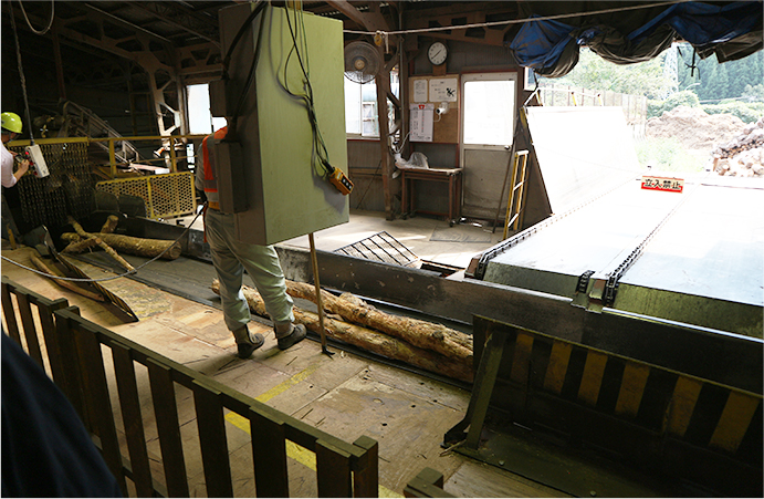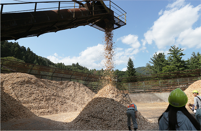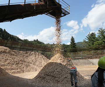 三菱製紙 北上工場では木材を細かく砕き、「チップ」と呼ばれる小さな固まりに加工しています。その後、木材チップを北上工場(岩手県)や八戸工場(青森県)に運び、パルプからFSC森林認証紙に加工しています。