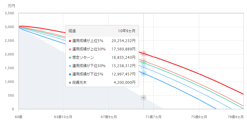 - グラフに表示する運用成績は、想定リターン通りに運用を行うことができた場合の値と、シミュレーションにおける毎月5,000通りのケースで計算した値を表示しています。
